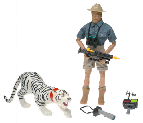 This Adventures Of GI Joe set includes a Classic Collection GI Joe figure with flocked hair, tan shorts, blue short-sleeved shirt, socks, tan boots, safari hat, binoculars, telephoto camera, tracking device, stun gun, white Bengal tiger, and a tracking collar.