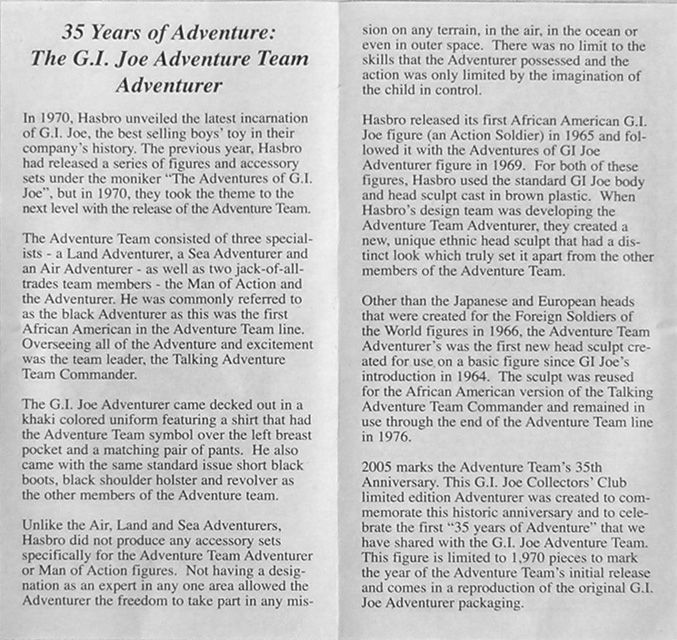 Dressed in reproduction tan uniform, the Adventurer looks clean-cut and cool. Like the rest of the Adventure Team, the Adventurer wears a black shoulder holster with reproduction revolver. The AT logo sits above one pocket. An extra AT logo comes with the figure to use as you see fit.