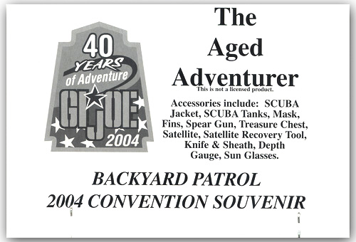 For the 2004 Convention, the GI Joe Club produced the Aged Adventurer. This Joe was based on a Joe created by Dave Pisani, Doug Fakkel, John Ellingwood and Tod Pleasant for their excellent 30th Anniversary of the Adventure Team diorama.