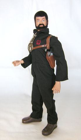 That's a black jumpsuit with AT logo, brown shoulder-holster and pistol, brown boots (reminiscent of the "Black Widow Rendezvous" classic AT set) with metal dog-tag (seen below). Also, a black leather jacket with AT logo!