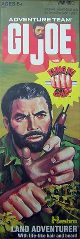 The box is a nice reproduction box which shows the Land Adventurer with hands posed in a gripping form, and shows a rifle slung over his back. The interior of the box is green.