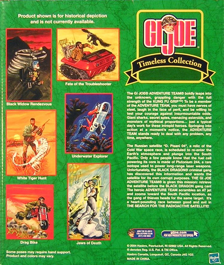 In 2004 Hasbro announced that there would be no new Adventure Team sets other than two store exclusives. Meijer, a store chain in the northern US area, would carry two Timeless Collection Adventure Team Joes. These were to use the 40th Anniversary bodies, flocked, with reproduction uniforms of the original Adventure Team Joes. Each would come with the AT shoulder holster and dog-tag, and would have Kung Fu Grip. Each would be packed with reproduction Adventure Team gear, and to top it all off, each would come in a reproduction coffin box like the original Joes. Not enough for you? How about they would be priced at $15.00