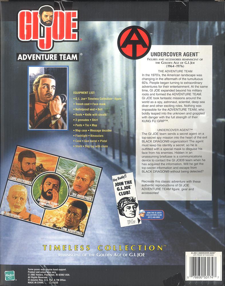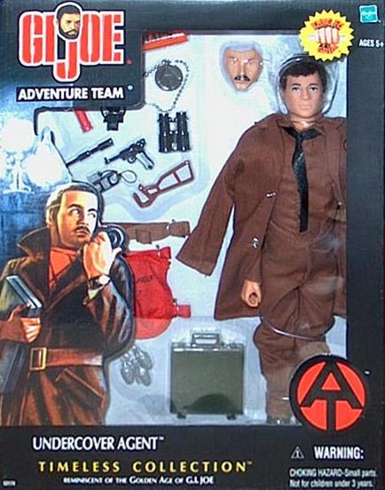 In 2002 Hasbro introduced a Toys R Us exclusive Timeless Classic Adventure Team reproduction set called Undercover Agent, which reprised the vintage Secret Agent (#7375) set very accurately.