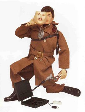The set includes a TC KFG flocked Joe wearing brown pants and shirt (with AT logo and black tie), a brown trench-coat, standard AT boots, but no shoulder holster, which differs from the vintage set. I guess since this figure had the brief-case with modifiable Luger, a shoulder-holster must have seemed redundant, but to be a better reproduction, it should have been included.