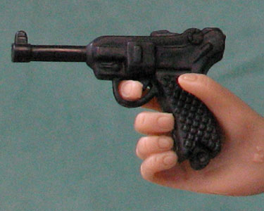 Now there is some dissatisfaction from fans because the original Adventure Team with Kung Fu Grip did not come with the shoulder-holster and pistol, but a rifle and strap. The original "nosepicker" AT Joes did come with the shoulder-holster and pistol, however. Personally, I think that most people remember the shoulder holsters and would think that the figures wouldn't feel like Adventure Team without the shoulder-holster and pistol. I also think that tossing in the rifle would have been a great move. Inexplicably, however, the WalMart Land Adventurer comes not with the gray Lebel pistol but with a black Luger. This has no basis in the AT history.