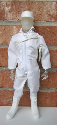 Here, Clear Joe is dressed in his "Mission: Splashdown" jumpsuit, boots and cap. He is wearing a white Cotswold reproduction shoulder holster. The gun is a white molded luger-like pistol I got from a Sandboxer. The jumpsuit is practically translucent itself, the fabric is so thin. It's a cool look for Joe.