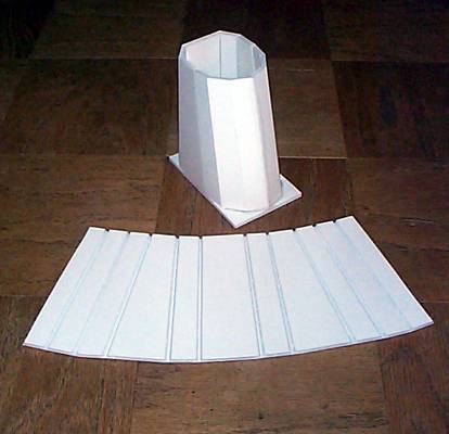 This picture shows one complete Dalek base, hot-glued down to the rectangular base, and a second Dalek base ready to be bent into shape. |