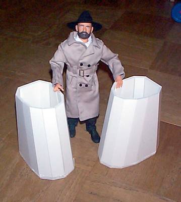 Here, the Doctor stands by the two Dalek bases. Note that I have trimmed the rectangular base to fit the countours of the Dalek panels. |