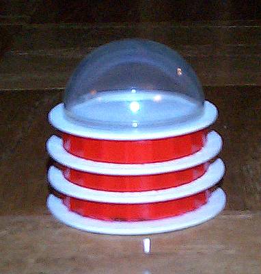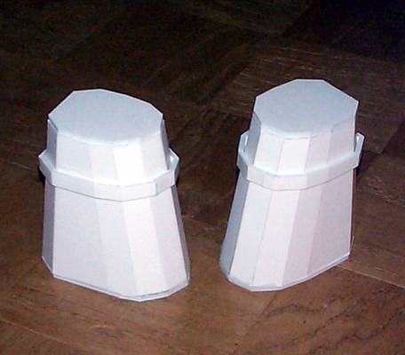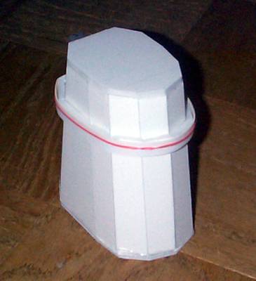 I capped off the top. On the flat part I'll put the cylinder that forms the "neck" atop which goes the head. The edging around the middle forms the divider between the sensored skirt and the screened upper torso. Just above these, the "plunger" and other arm will go. |