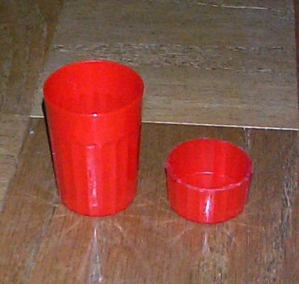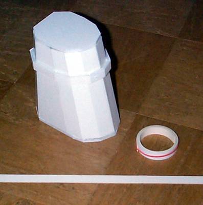 Next up is the neck column. I neede a tapering cylinder, and at first I was going to use a mailing tube, but then I stumbled upon these plastic cups. I cut them down to the little stub you see here. |