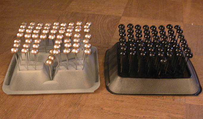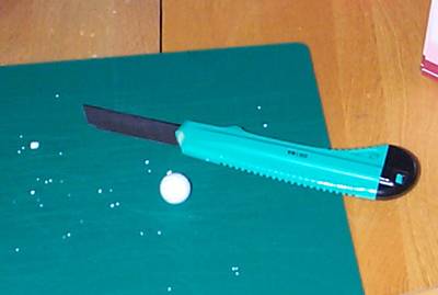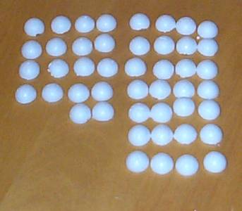 The skirt sensors are 1.5cm hard styrofoam balls. I found these at a craft shop (not the crystal-flaky styrofoam balls) but they were $.19 each. That meant for the 60 I bought, I had to pay about $12.00. I used a knife on a cutting mat to bisect the spheres along the natural molded seam. I rocked the blade back and forth over the seam, cutting deeper and deeper until the halves separated. Warning! Some of these crumbled pretty badly. Always buy more than you need. |