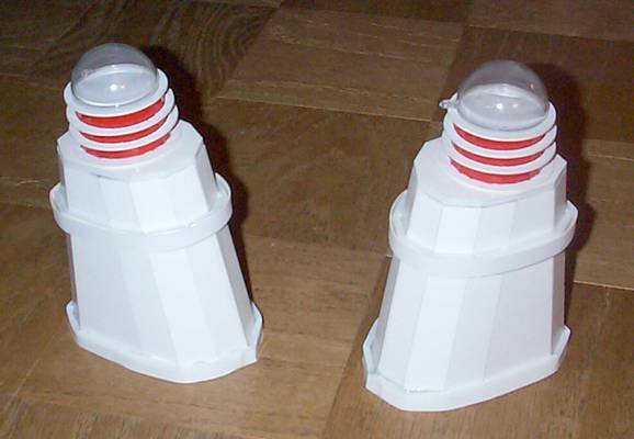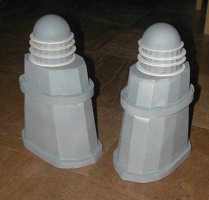 the Daleks. Also, I hot-glued a strip of foam-core to the very base of the Daleks, to form the skirt base. At this point it's ready for priming and painting. Then I have to add screening to the upper body, supports between the round plates on the neck structure, the arms and eye pieces. It's been a long haul, but we're finally able to see the light at the end of the tunnel. |