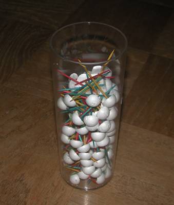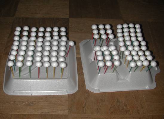 There are over 100 subdivided styrofoam balls in this container. I inserted pointy toothpicks in the backs of them so I coud array them in styrofoam for spray-painting. |