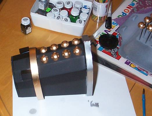 silver, and half gold. The wood glue rivet application held up a little better, but I was concerned that the rivets were still too shallow, and paint would basically erradicate my efforts. To my utter delight, when the paint went on, the rivets were very accentuated, even exaggerated, rather than being hidden by the paint. |