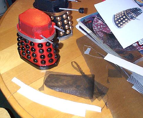I bought some fiberglass window screening material for the Dalek "chest" area. I first cut a form out of paper that fit perfectly around the Dalek chest, joining in front. I probably should have joined it in the rear because that seam would be on camera less, but it would have been more difficult. I then used that form to cut the screen. Luckily the fiberglass screen cut very easily, and is quite flexible. This picture shows the red Dalek with screen attached (with hot glue at key points) and the second screen about to be cut. |