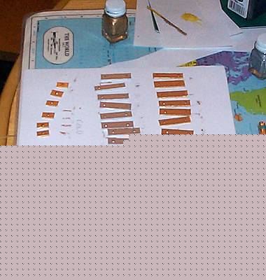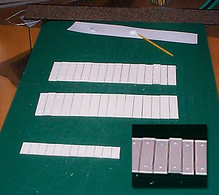 Here I cut the chest slats. I figure from blueprints and photos about 16 long slats and 6 short slats (for the front) per Dalek. These are cut from the same sheet of matte board I used elsewhere in the project. 3.5cm tall and 1.77cm tall. Note that I used white glue to form "rivets" at the top and bottom of each long slat, and in the center of each short slat. Note: Problem here. When I applied the first dots of white glue, once dried, they basically disappeared. They faded into the cardboard. So I applied a second time. Same result. Then I used a yellow wood glue. The inset here is enhanced to show contrast, so shows off the rivets fairly well. |