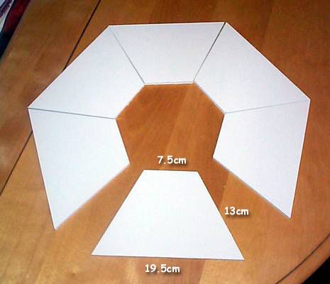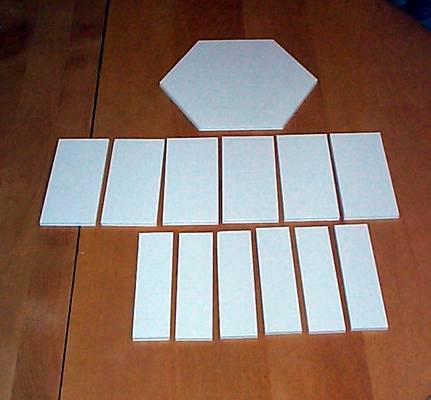 I began with six trapezoidal sections of foam core. I measured these from the Doctor Who Technical Manual. The ends are 19.5cm long, the inside length is 7.5cm and the connecting edges are 13cm long. |