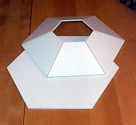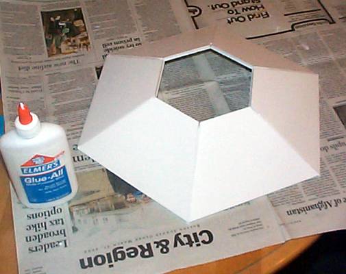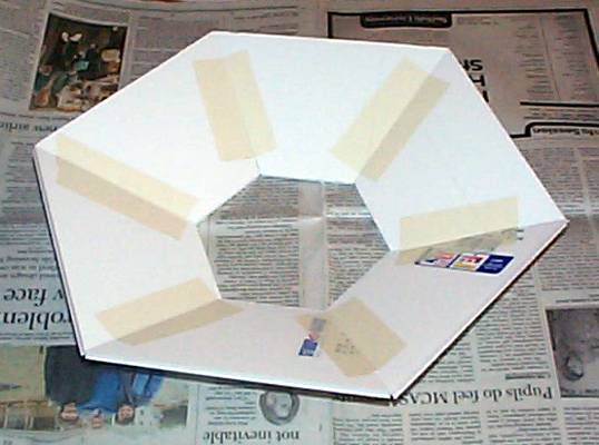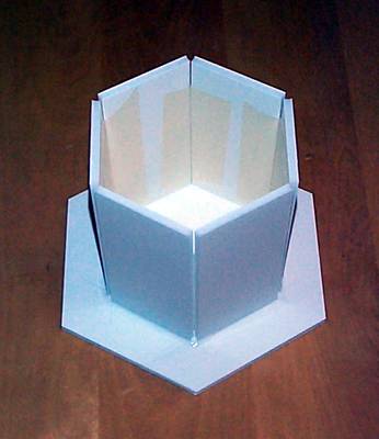 Then I form a hexagonal extrusion. This gets glued to the hexagonal base using lines I drew on it for alignment. I use white glue for caulking at the base, all the way around. I make no attempt to fill the gaps between the six panels, as those gaps will be filled in the next step. |