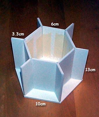 I started with a hexagonal base, and two sets of six rectangles. The top set of six are taped together, with the tape acting as a hinge. The hexagonal base measures 10cm per side. The plinth inner panels measure 6cm wide by 13cm tall. The plinth supports are 3.3cm wide by 13cm tall. (See image two down) |