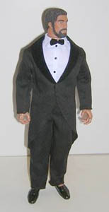 The tuxedo is a Ken wedding tux, and is one of the nicest I've seen. It has long tails. (I got married in tails.) The hat and walking stick came from a yard sale where someone was selling craft supplies. This was a kit that came with styrofoam balls to make a snowman or some other nonsense. I noticed it should fit a smaller-headed GI Joe well, and I was right.