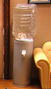 I also created the water cooler by Spade's door. I took a "Red Bull" can and a small Poland Springs water bottle. I painted the can silver, and filled the bottle with water.