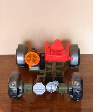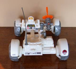 | The Action Man Lunar Rover. (The AT stickers are mine.) The body is completely white, including the seat, control panel, fenders and front sensors. The wheels, foot pedals and controls are silver-grey. This model has an antenna. | The Small Soldiers Ground Assault Vehicle. The body is military green. The seat and control panels are bright red. The fenders and front sensors are dark silver. The wheels are black. This model has no antenna. |