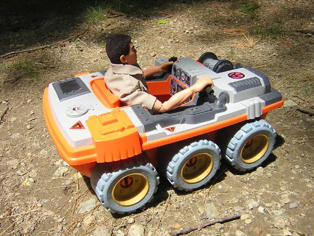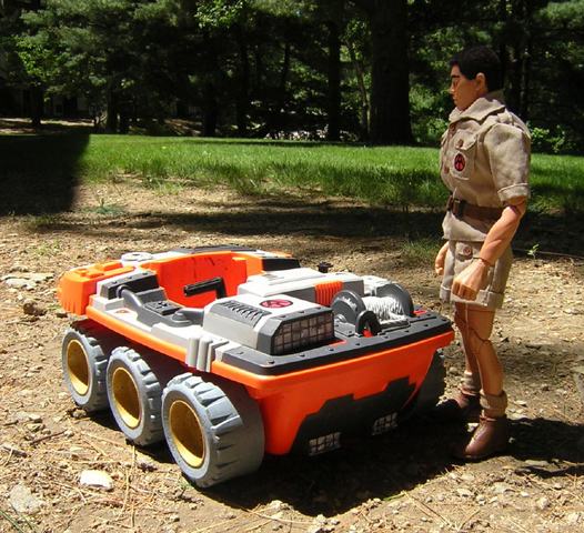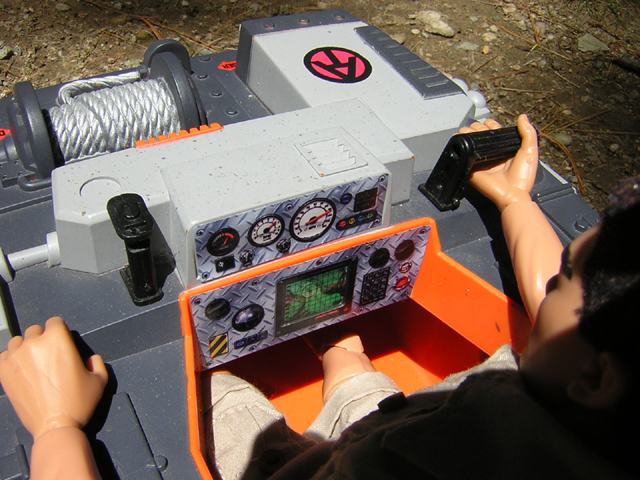The controls are less like the original ATV and more like the ATV Buggy. On the right is a throttle that is simple in operation. Push forward for forward. Pull back for reverse. The joystick on the left steers the vehicle. Lean it left for left, right for right, rotate it left for a left spin, and rotate it right for a spin right. The gauges you see include the obvious, fuel, speed, etc, but also a global map computer and communications equipment. |