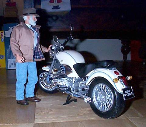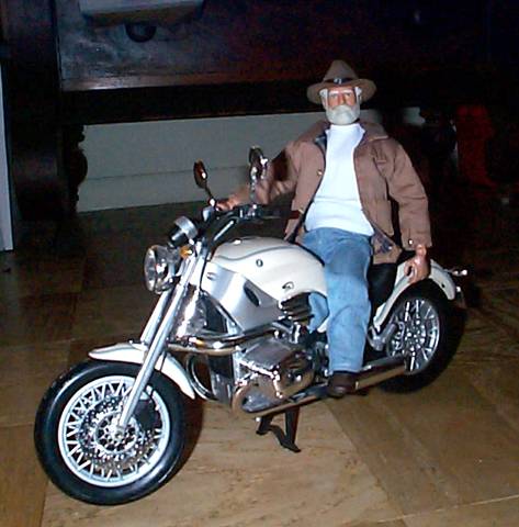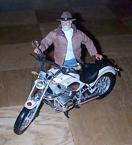 The Commander kicks back on his bike waiting to take it out on the road. (Note that the Commander is not wearing a helmet or adequate biking clothing. This is because he's not ready to take it on the road yet. Don't ride on a motorcycle without the proper protective gear.) |