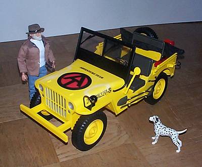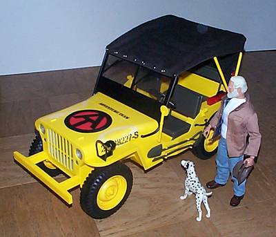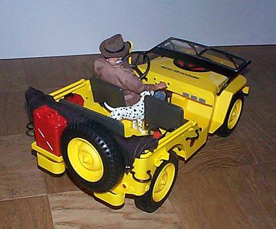 Here, the Commander has put the windshield down. Dale, his dalmation stands next to him as he puts the vehicle in gear.. A tool kit can be seen next to the rear seat on one side, a fire extinguisher on the other. More of my additions. Here, the black cloth top is in its folded position. I painted a military green gas tank bright red to fit in with the Adventure Team theme.