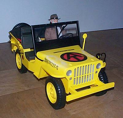 Here, the Commander put the cloth top down to reveal the interior. The commander thought that the black windshield would make a more dramatic contrast than the original yellow. Likewise some side details. You'll note the slight white discoloration on the hood. Stupid me. I used paint thinner to remove the letters "U.S.A." and the thinner scarred the plastic. Nothing anti-American, it's just that the Adventure Team is an internationally-based organization, and I wanted to ensure that the vehicles reflect this fact. |