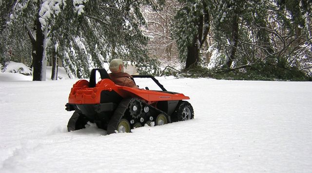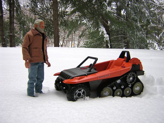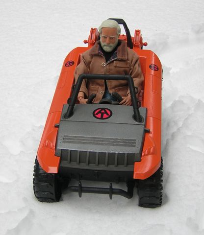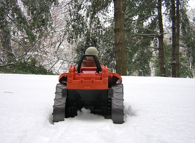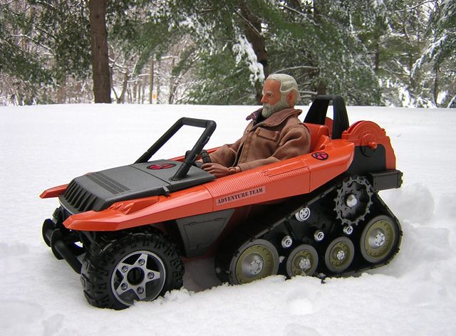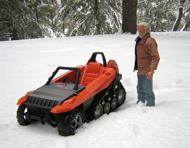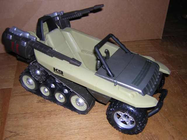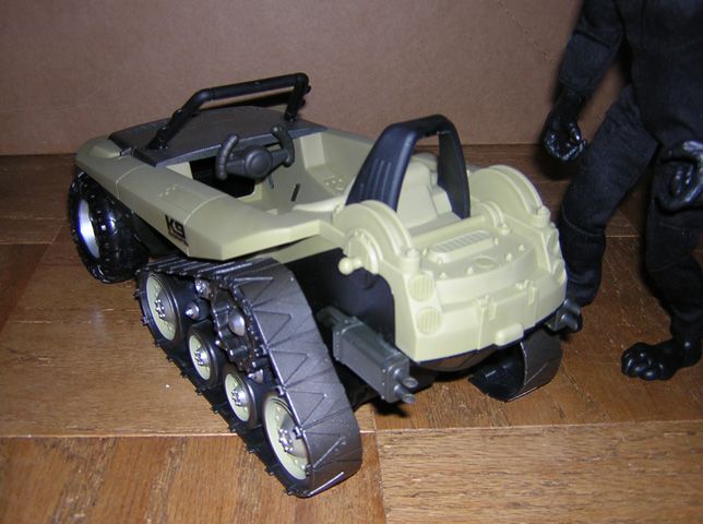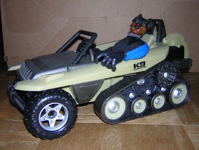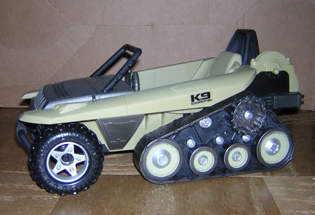 The K9 Corps Dune Scorcher is a small ATV-like vehicle with two front wheels and a rear tracked assembly. (The tracks are non-functional. There are small wheels underneath that it rides on. The front wheels roll fine.)