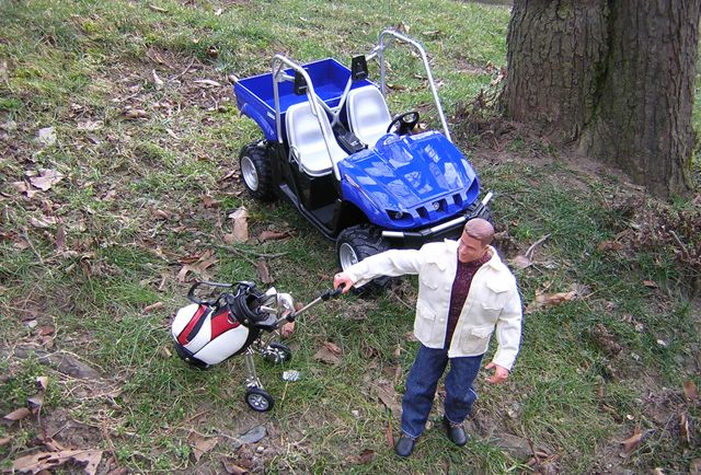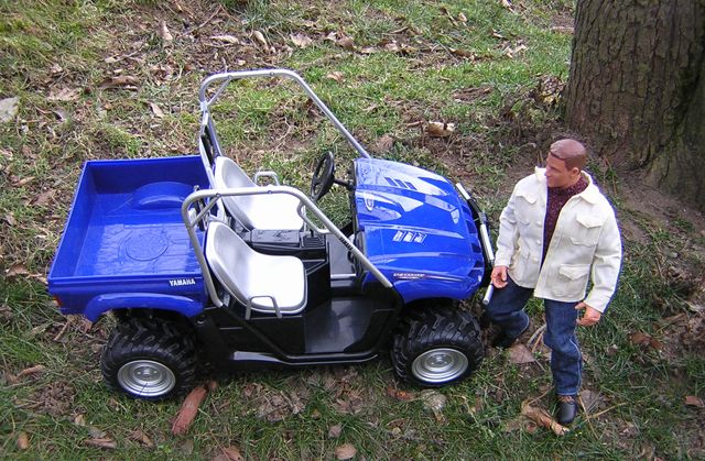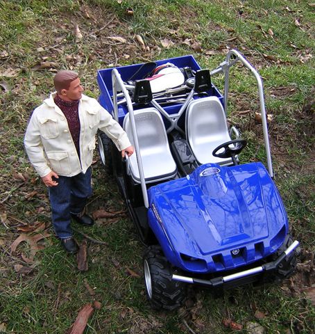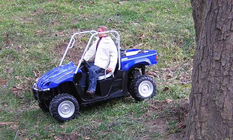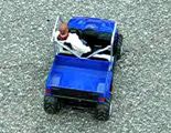 This one is an R/C vehicle, and seats two fairly comfortably. The rugged wheels move nicely over pavement or rough terrain, and the real spring suspension means that even rough terrain is negotiable. Carl has no trouble staying seated over bumpy ground.