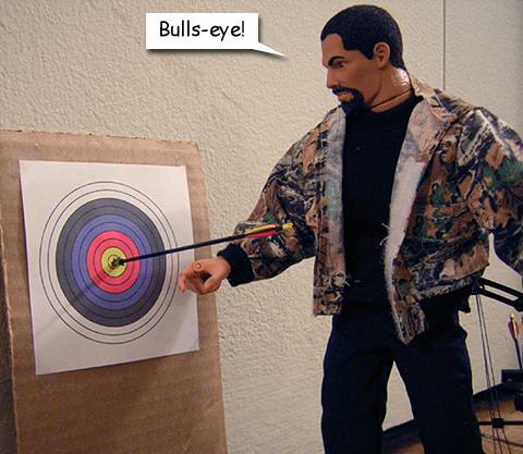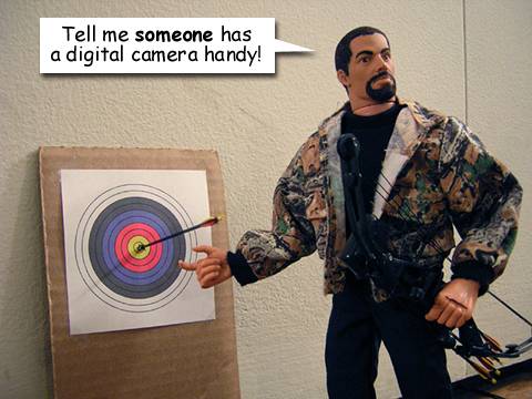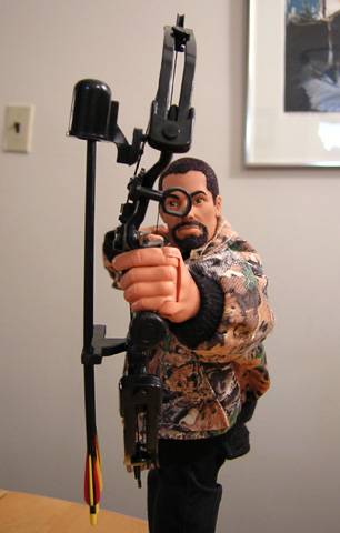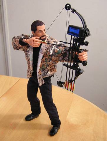 ERTL, in its latest hunting figure series, has included an excellent 1:6 scale compound bow. This bow, I can certify, is incredibly life-like. It has rotating gears, sights, a quiver with four molded-in arrows and one loose arrow. The bow loads and looks fantastic in firing position. Have a look:
