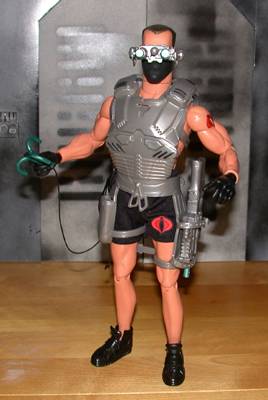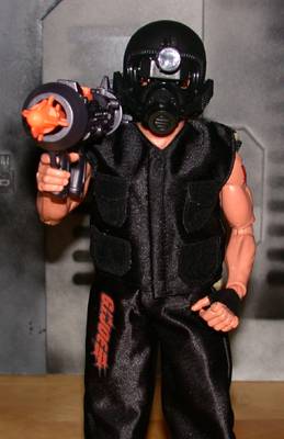 Firefly is a Cobra operative. He comes equipped with body armor, gun, suction-cup kneepads and suction gun, boots, shorts, black balaclava, night-vision headset, grappling hook and rope, gun and explosives.