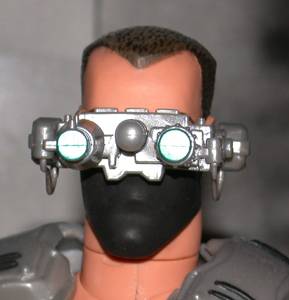 helmet with silver eyecovering, and antenna. His gun comes apart