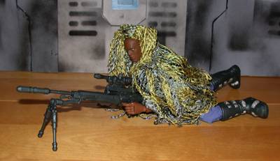 sniper rifle. Top it off with a ghillie camouflage poncho, and