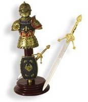 The armor bust is molded from some material. It's solid, the armor and shield do not remove. However, the real metal sword does. It's got a gorgeous blade, and the handle is nicely molded, though made of a very coppery metal that looks a little too chromy. Not bad, though, for $9.99