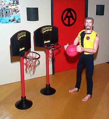 I found these at a Decelle store. They come on card. The basketball is basically a ping-pong ball. It is meant to be a table-top basketball game. With some alteration, including an AT logo, this could be turned into a GI Joe one-on-one driveway basketball net for the Adventure Team Training Center. $4.99 for the set.