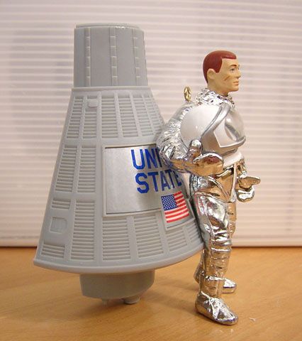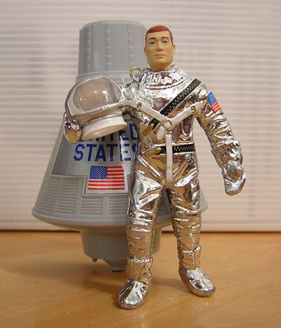 The second ornament this year is the larger format ornament, of the vintage 1966 Astronaut Joe. The space suit is chromed nicely to mimic the original foil fabric of the suit. This one has the three zippers, the most desirable of the various space suits Hasbro made for Joe back in the day.