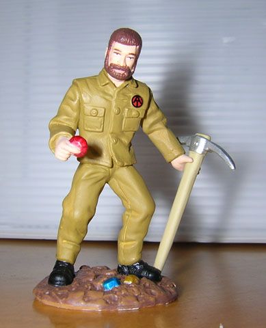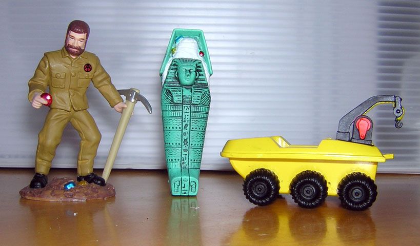 The figure is almost 2.5 inches tall. He's wearing the tan outfit, carrying the pick-axe from the set, he has a very nice tiny AT logo on his chest, and holds one of the gems that came with this vintage set. on the ground are the other two gems. Nice eye for detail. I think I would have put the pith helmet on him, though, for completion.