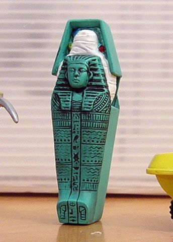 The sarcophagus is amazingly detailed. Even the paint is exactly the right color, with the faded black details. We're talking amazingly accurate detail, and while the sarcophagus is a solid molded piece (and does not open and close like the original it is based on) it does include the three gems. It even has the small tab at the rear base that the front cover clicked into.
