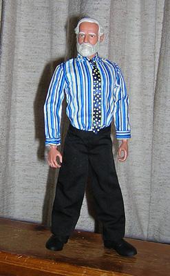 This one takes the cake! Similar to others, with the Chippendale-like sleeveless shirt-pant combo, but it's made of good linen. This one fits well, looks elegant, and so far is the nicest tailed tuxedo I have for Joe.
