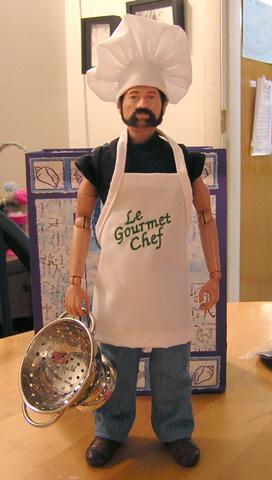 This is a shot of my young AT Commander (too young to grow a full beard apparently) wearing a Le Gourmet Chef apron with chef's hat. He's carrying a colander.