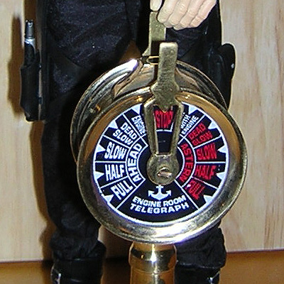 This is a nice little item I got at Home Goods for $8.00. It's a brass ship's Engine Room Telegraph. This is highly detailed, and the handle clicks as it moves around the dial. Here, Dylan Hunt from Andromeda tells his helm room to stop.
