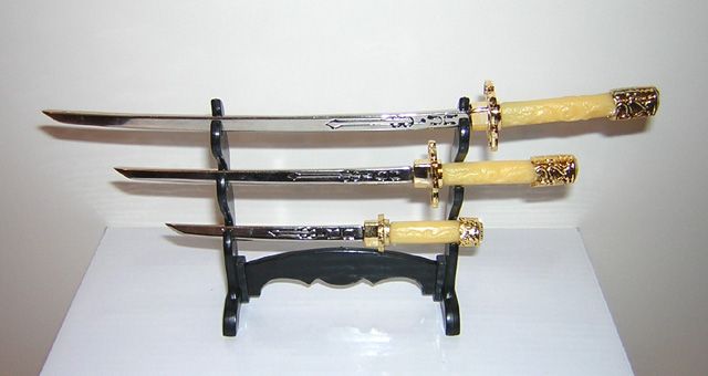 Katana, Wakisashi and Tanto on three-tiered display stand. Go to BudK, and enter item #RT995 in the search window at the top, or click here.