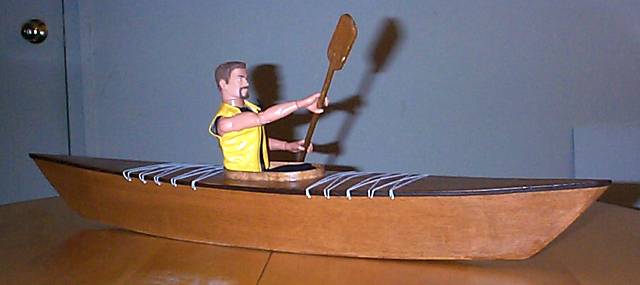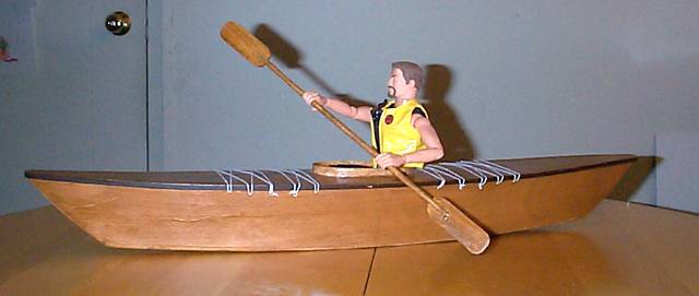 I found this wooden kayak at TJ Max for $8.00. I was a bit shocked to see it. Then I looked at it. Every detail clicked into place. It was perfect. There is a block of wood in the way of the legs, but with a bit of effort, Joe can fit fine. With some work, I could carve out more room, so I wouldn't have to struggle to fit him in. I haven't tested it yet, but it looks seaworthy.