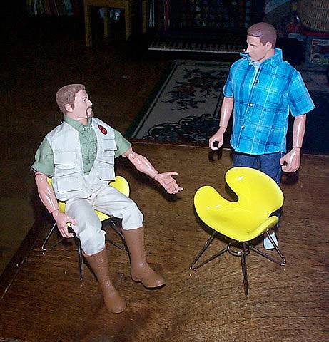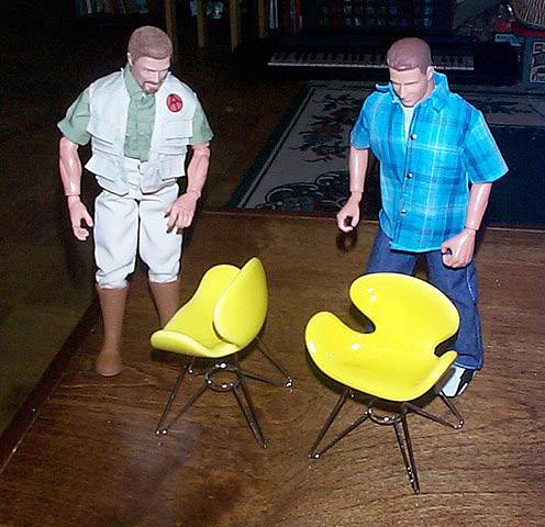 My wife reported a month or so ago that she saw in a store in the Boston area several very cool retro-design chairs that might fit my GI Joes. They cost around $15.00 a chair, so I told her that was too much for me, and thought no more about it. This weekend, my wife reported that the same chairs were now available at iParty at a local mall. I investigated. I bought these two for $9.95 each.