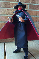 I took the carton from a Universal Monsters "Invisible Man" figure, strapped The Shadow to the built-in figure stand, and designed my own label for The Shadow. Click any image for a closeup.