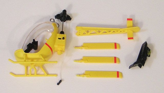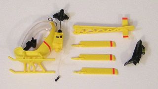 The helicopter itself comes apart too, with a little jiggling. I got it down to this many pieces, and I know that if I tried, I could get the landing gear off. I managed to loosen the control pillar, but it wouldn't come out entirely. I think I need a tool to lever it out of its slot.