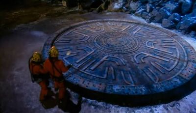 He reaches the end of his cable and sees no bottom, but he takes a leap of faith and jumps. He wakes in oxygen, his faceplate broken, but he's breathing and alive. He was caught by an air cushion. He sees the history of the Beast drawn on the walls, and sees the key to the prison - two Amphoras on pedestals.